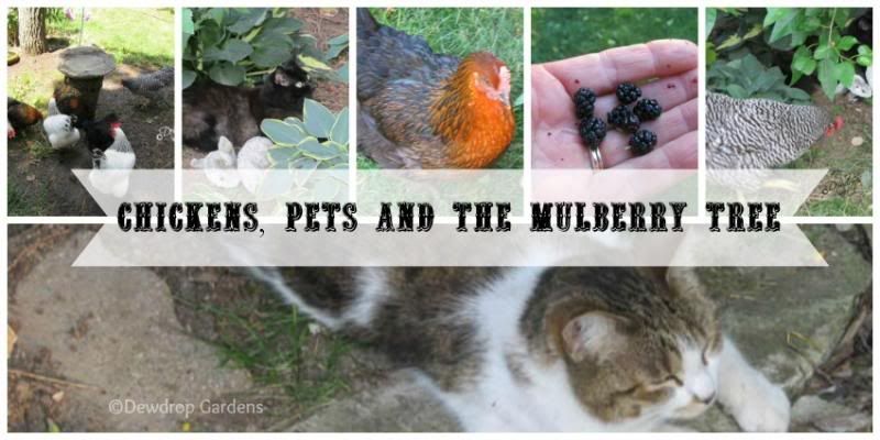 The mulberries were ripening up fast. One day last week, a couple squirrels were having a feast way up in the tree! Silly cat that Pickle is, he was lying in wait for one of them to fall...at least that is what Larry said he was doing...and doesn't he know squirrels are tree dwellers and don't fall?