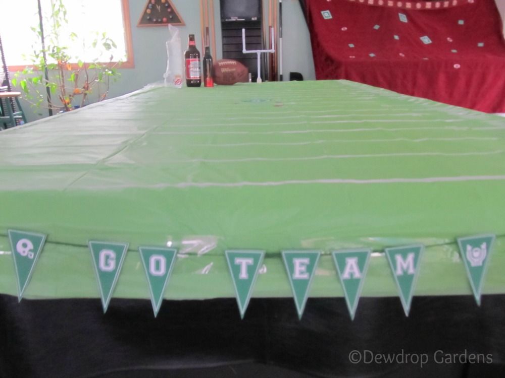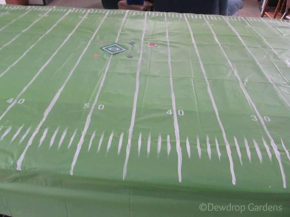 So, I painted a football field on our pool table. Well, actually I painted the dollar store tablecloths covering the plywood on top of the pool table. I don't think Larry would have appreciated me painting the felt. To put it mildly...