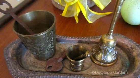 | I set the cloche on our family Bible with a bird, brass pear and egg-cup filled with a twine wrapped egg. |