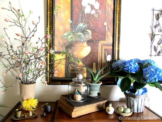 Heather, from New House New Life New Home, gave me some branches from her magnolia tree when we met earlier in the month. The branches I forced are finished, so I really appreciated them to fill up this space. They are starting to bloom and I like the height they give to the vignette.